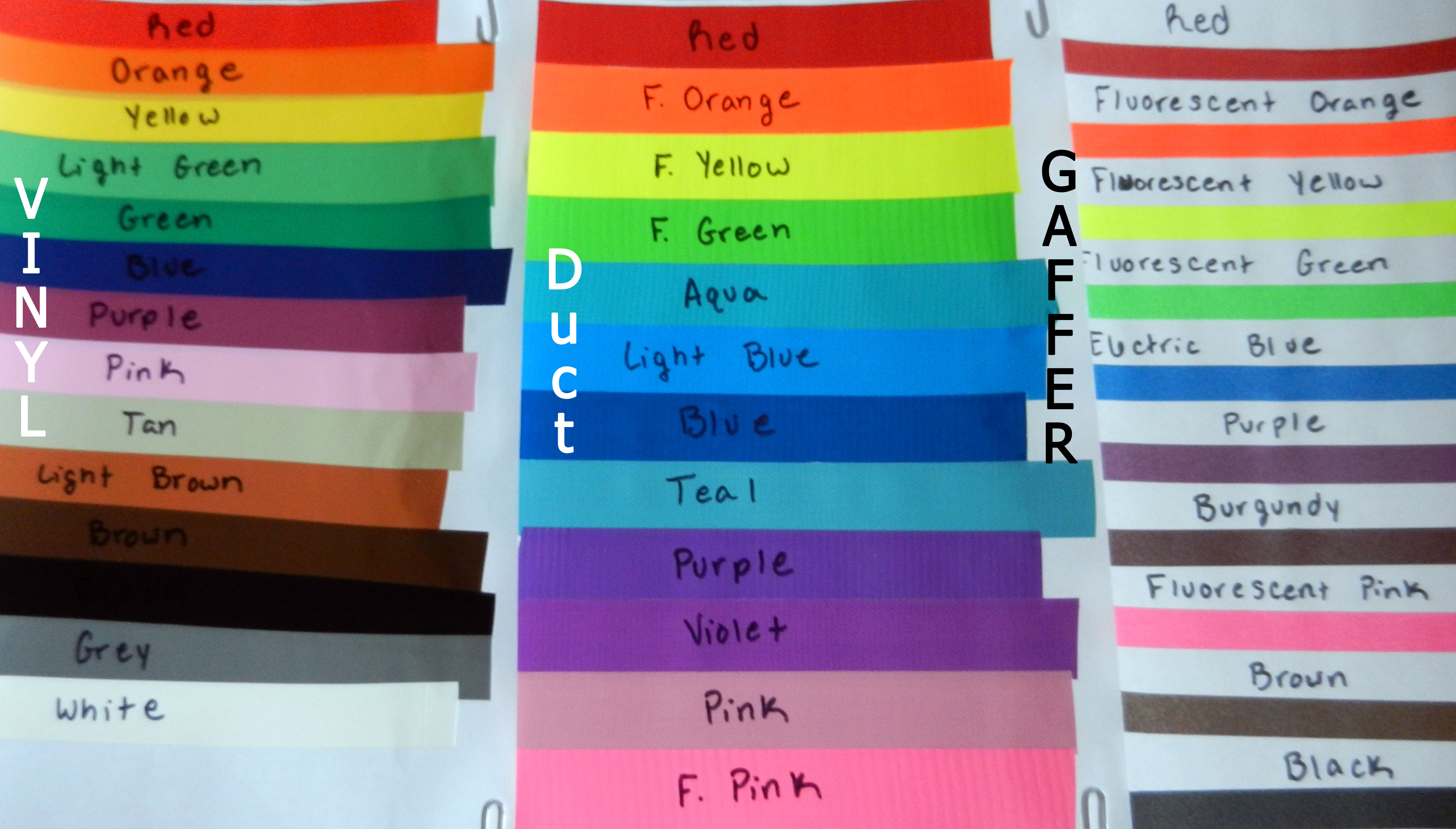 You can choose virtually any color combination you can think of for your very own custom HoopBunny Hula Hoop! The photo below displays all of the colors available in three different types of tape: vinyl, duct, and gaffer (grip) tape.